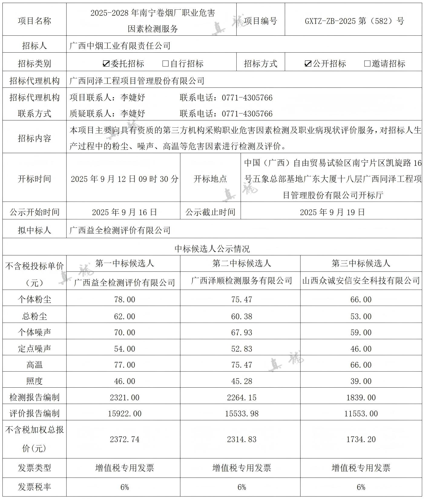 广西中烟工业有限责任公司2025-2028年南宁卷烟厂职业危害因素检测服务(项目编号:GXTZ-ZB-2025第(582)号)中标候选人公示